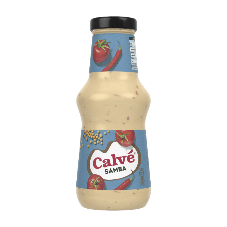 Calvé samba saus is een smakelijk romige, lichtzoete saus met een beetje pit.