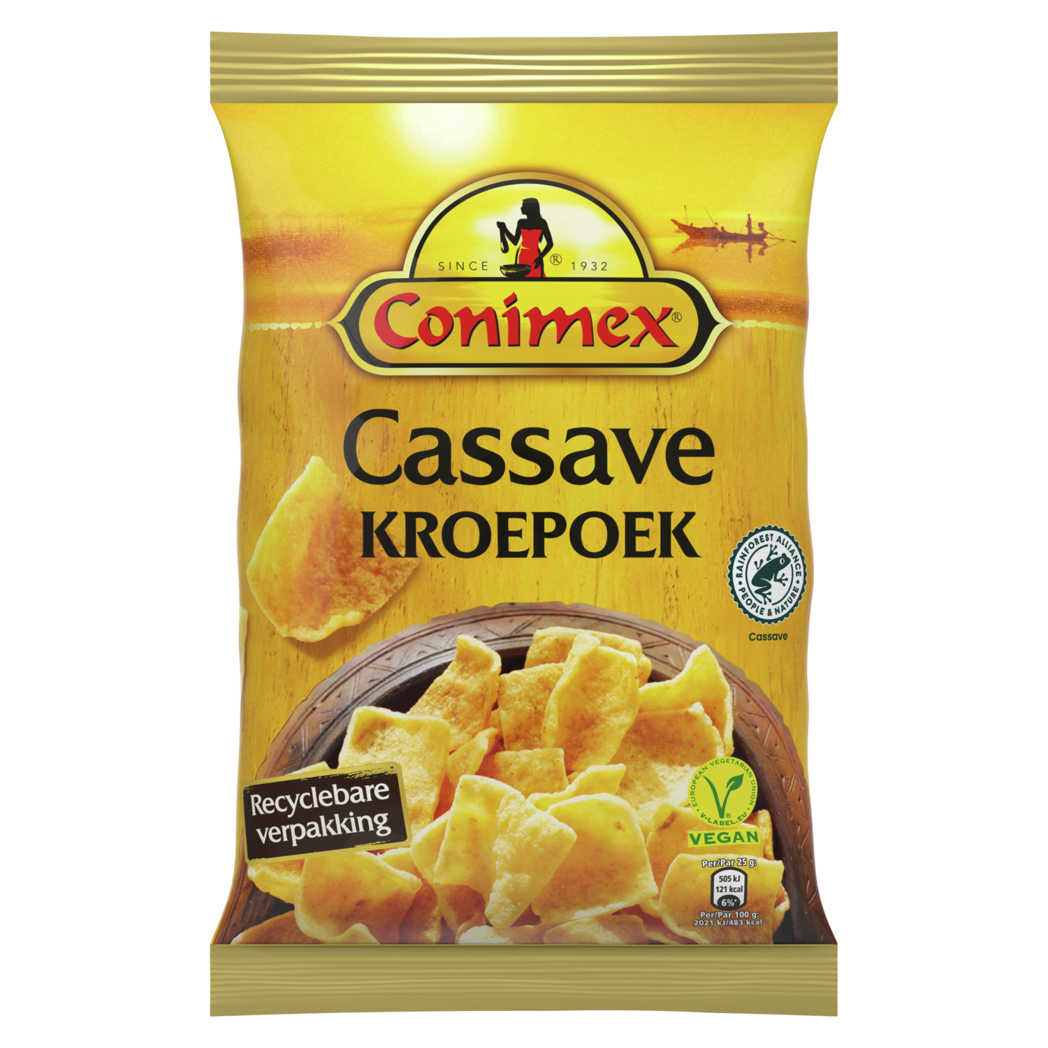 Conimex cassave kroepoek is gemaakt op basis van plantaardige ingredienten zoals cassave, tapiocabloem en een mix van groenten en kruiden.