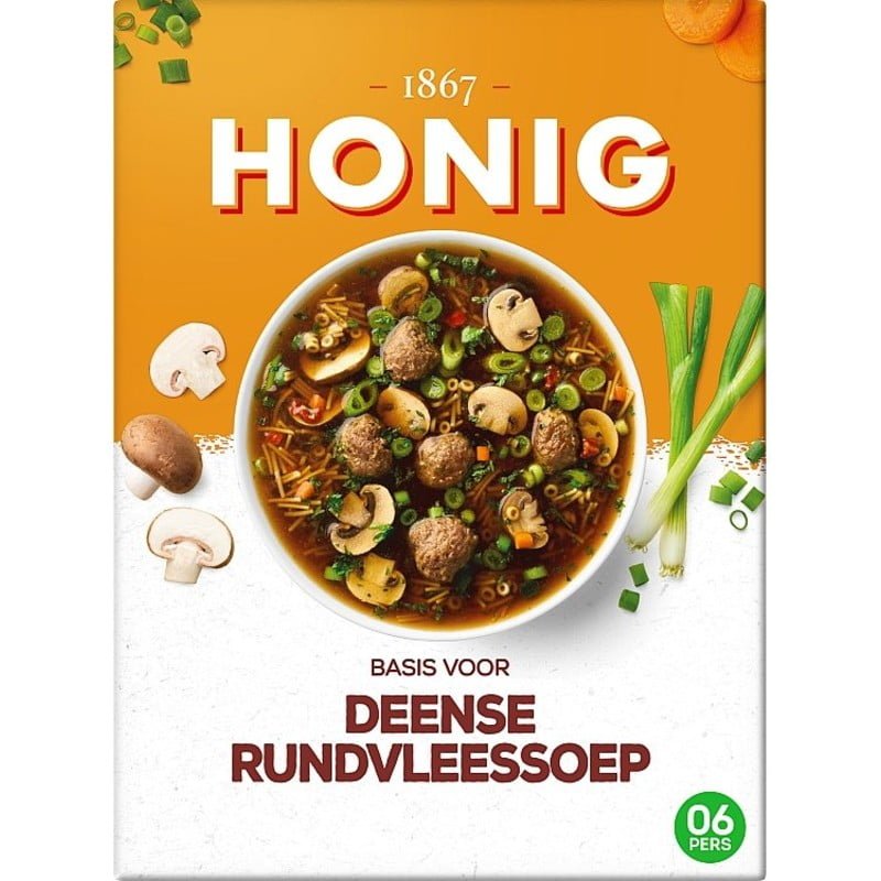 Honig deense rundvleessoep is een heldere bouillon, gevuld met vermicelli en soepgroenten en is op smaak gebracht met tuinkruiden. Voeg verse ingredienten voor een heerlijke soep.